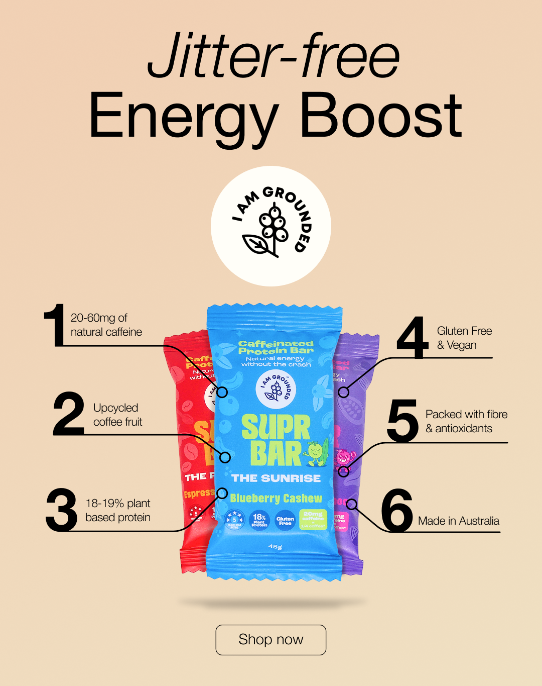 Discover I Am Grounded’s 5-Bar Sampler Pack featuring Espresso, Cocoa Almond, Lemon & Coconut, Salted Caramel and Blueberry bars. Vegan, gluten-free & made with upcycled coffee fruit for a clean, crash-free caffeine boost. Perfect for on-the-go energy and antioxidant support—try your favourite flavours today!